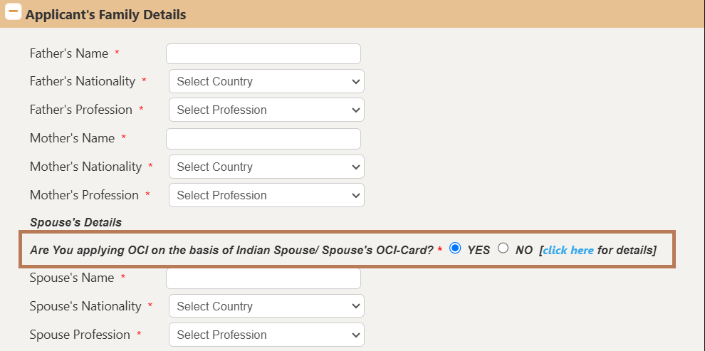 - Important Please note For OCI applicants applying based on Indian Spouse/ Spouses OCI card category than select as Yes in the Spouse Details column.