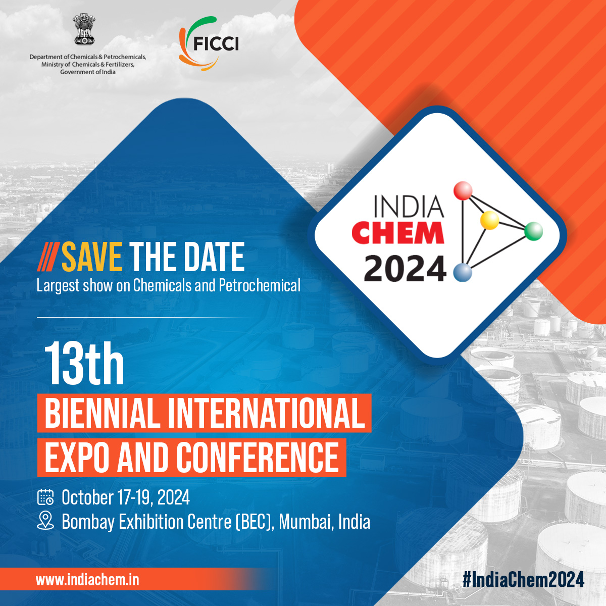 The 13th edition of India Chem 2024, the flagship event of the Department of Chemicals and Petrochemicals, Ministry of Chemicals and Fertilizers, Government of India jointly organised with the Federation of Indian Chambers of Commerce & Industry (FICCI) is happening on October 17-19 at the Bombay Exhibition Centre, Mumbai. For more information, visit https://www.indiachem.in/  #IndiaChem2024 #Chemicals #Petrochemicals